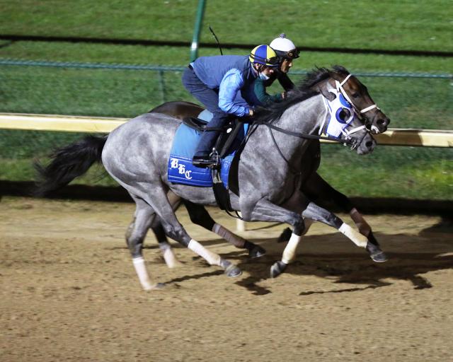 The action began early Friday at 5:25 a.m. (all times Eastern) as 2019 Preakness Stakes (GI) winner War of Will worked with jockey Declan Carroll in the saddle. The duo clipped through fractions of :11.60, :23.40, :34.80 and :46.80. They continued galloping out strongly around the clubhouse turn and completed six furlongs in 1:12.20, seven furlongs in 1:24.80 and were up one-mile in 1:38.40, according to Churchill Downs clocker John Nichols.
