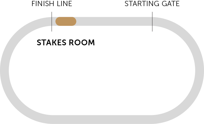 The Stakes Room blends 150 years of tradition with a fresh and contemporary atmosphere that celebrates a storied past and spectacular future for Churchill Downs. The oval-shaped bar in the Stakes Tavern is designed in the shape of the track, complete with pole markings. This area caters to the horsemen and distinguished guests that carry on the legacy of horseracing.